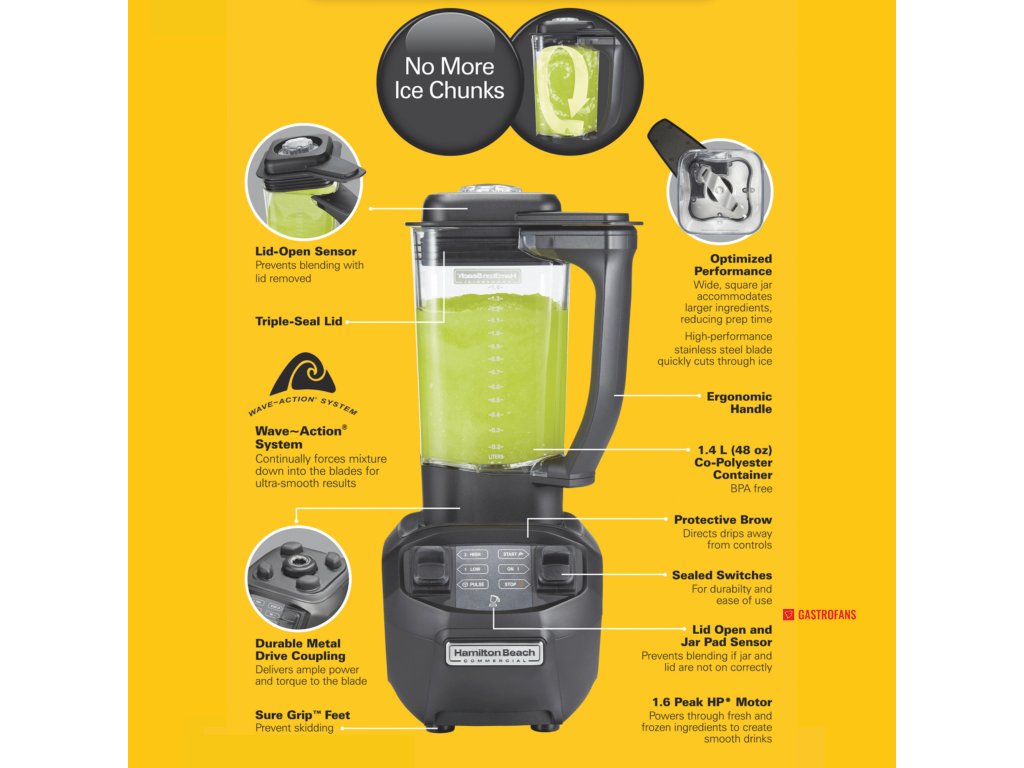 - Optimalizovaný výkon — široká čtvercová nádoba pojme větší ingredience, což zkracuje dobu přípravy, a vysoce výkonné nerezové ostří rychle seká led.