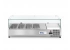 Teplotní rozsah +2 až +10°C| 1500×434 mm Kapacita 7× GN1/4 × 150 mm (nádoby nejsou součástí) Statické chlazení s elektronickým ovládáním Skleněný kryt pro ochranu surovin...