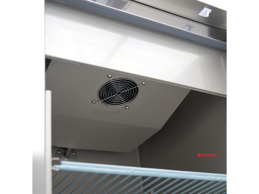 Tato chladnička je vybavena výkonným ventilačním chladicím systémem, který zajišťuje stabilní vnitřní teplotu v rozmezí -2 °C až 10 °C. Chladicí cyklus je navržen tak, aby minimalizoval tvorbu ledu, zatímco ventilátor zajišťuje účinnou cirkulaci vzduchu, čímž omezuje vznik horkých míst a zajišťuje rychlé a rovnoměrné ochlazení veškerého obsahu. Digitální regulátor teploty se snadno ovládá a přístroj používá ekologické chladivo R290, které neobsahuje freony a je bezpečné pro vysoce výkonné použití až do okolní teploty 40 °C. Vyhřívané gumy dveří zabraňují jejich zasekávání, takže se hladce otevírají i při nízkých teplotách.