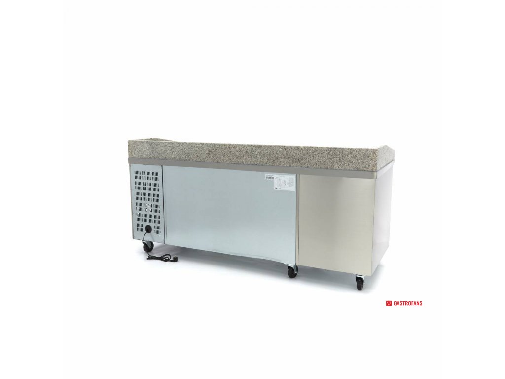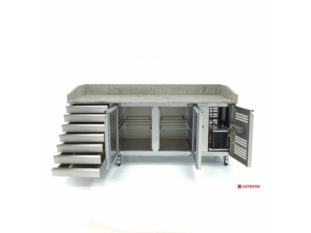 Hledáte profesionální chladničku na přípravu pizzy s chladicím systémem a praktickými zásuvkami na kynutí těsta na pizzu? Tato chladnička má luxusní design a je nepostradatelná v profesionální gastronomické kuchyni. Konstrukce z nerezové oceli má velkou žulovou pracovní desku s velkým prostorem pro rozválení a položení základů na pizzu. Na pravé straně této chladničky na přípravu pizzy se nachází výkonný chladicí systém s kapacitou 580 litrů. Chladicí systém s ventilátorem zajišťuje stejnou teplotu v celé chladicí jednotce. Vedle chladicího systému se nachází sedm zásuvek na těsto, které není aktivně chlazeno. Je ideální pro ponechání těsta na pizzu kynout.