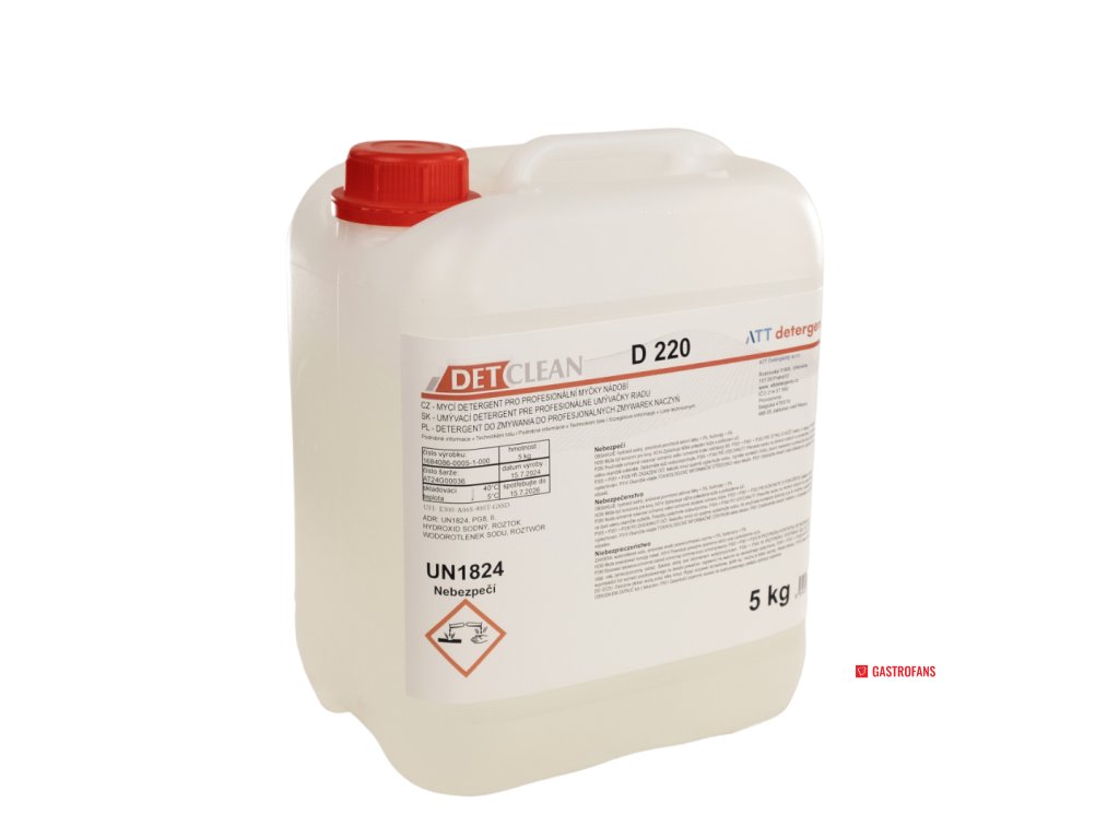 DETCLEAN D 220 je univerzální tekutý mycí detergent pro průmyslové myčky nádobí, vhodný pro mytí všech druhů nádobí s výjimkou předmětů z barevných kovů. Je určen zejména pro měkkou a středně tvrdou vodu. Tento alkalický tekutý mycí prostředek obsahuje hydroxid sodný a povrchově aktivní látky. Složení je bez fosfátů a aktivního chlóru, což zaručuje vysokou biologickou odbouratelnost. Přípravek je optimální pro průmyslové myčky s manuálním i automatickým dávkováním. Účinně odstraňuje silné znečištění a je vhodný pro nádobí, příbory i sklenice, kromě hliníkových předmětů.
