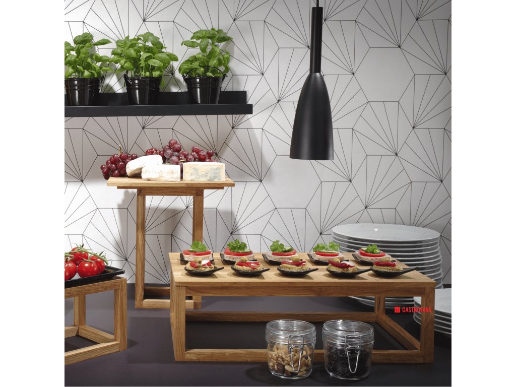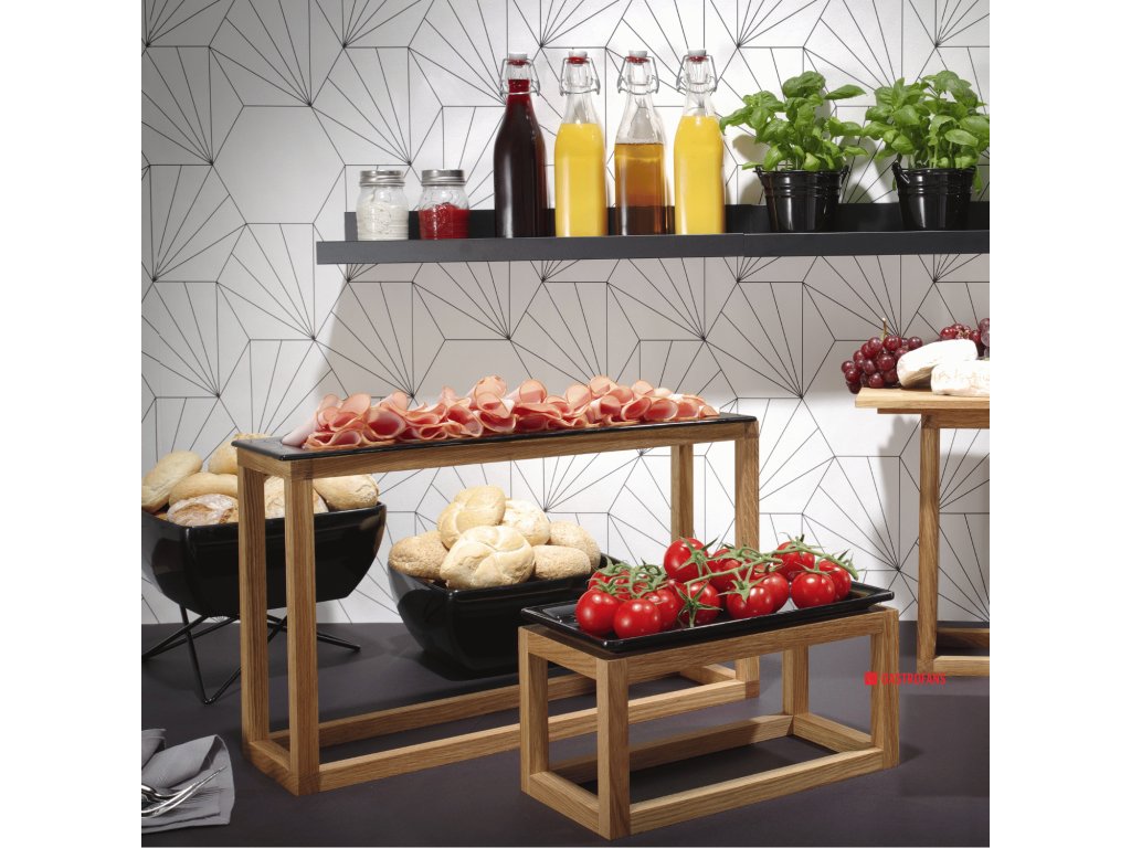 Dřevěná konstrukce pod tácy GN 1/1 je funkční součástí systému bufetových stojanů Madeira, který umožňuje sestavovat víceúrovňové a estetických bufetových konstrukcí. Je vyrobena z přírodního dubového dřeva, vyznačuje se odolností, pevným provedením a univerzálním vzhledem, který se perfektně hodí do různých interiérů jak rustikálních, tak moderních.