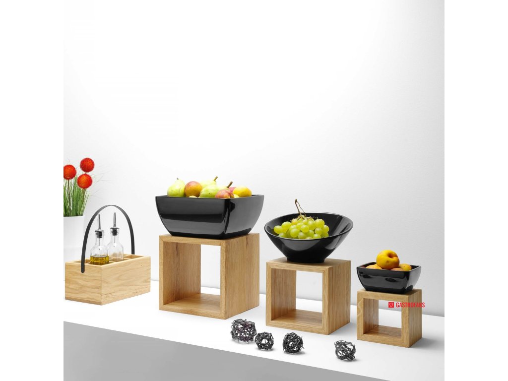 Součástí kolekce jsou mimo jiné elegantní stojany, bedýnky, podnosy a nádoby, které umožňují estetické a přehledné vystavení potravin, jako je pečivo, ovoce, cukrovinky nebo příbory. Dřevo, ze kterého jsou tyto prvky vyrobeny, se vyznačuje mimořádnou trvanlivostí, odolností proti poškození a nadčasovým vzhledem, což z nich činí vynikající investici na dlouhá léta.