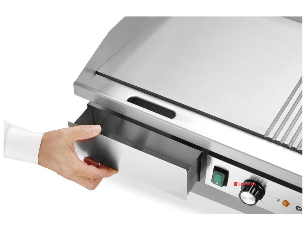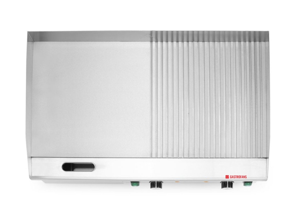 Rošt má rozměry 717x383 mm a je napůl žebrovaný. Pevná 10 mm silná tvrzená ocelová deska nabízí vynikající zadržování tepla. Nabízí 2 samostatně nastavitelné topné zóny. Dodává se bez zástrčky.