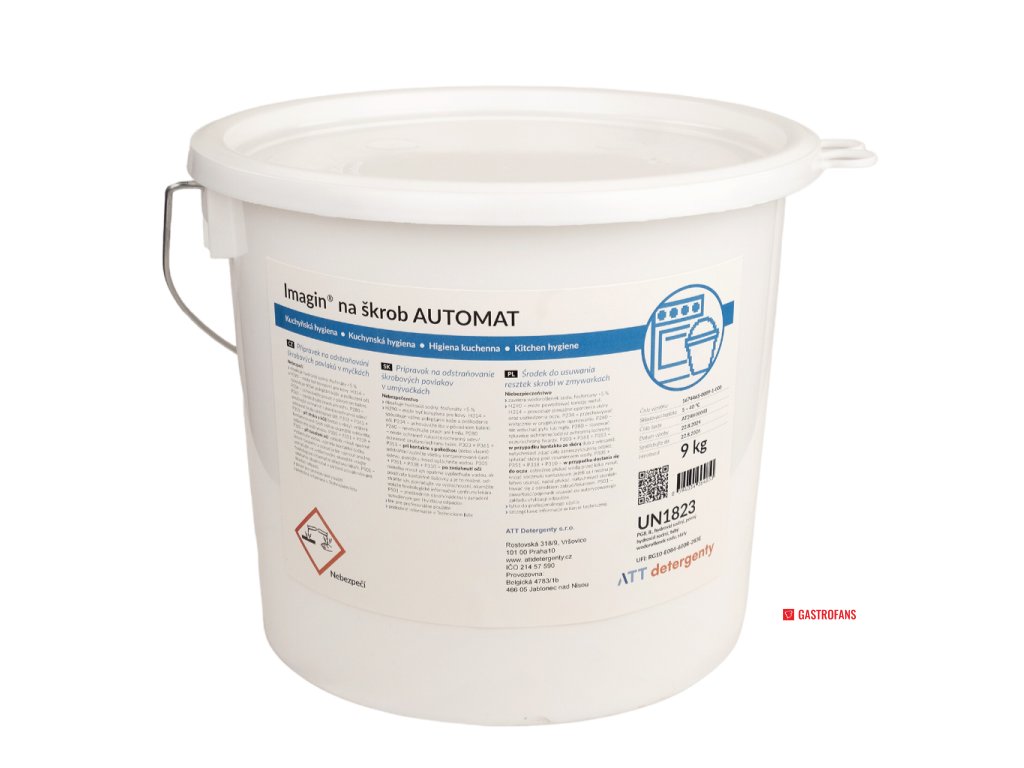 Imagin® na škrob AUTOMAT je vysoce koncentrovaný alkalický práškový prostředek bez chlóru, navržený pro strojní i manuální odstraňování obtížných škrobových a bílkovinných povlaků z nádobí.