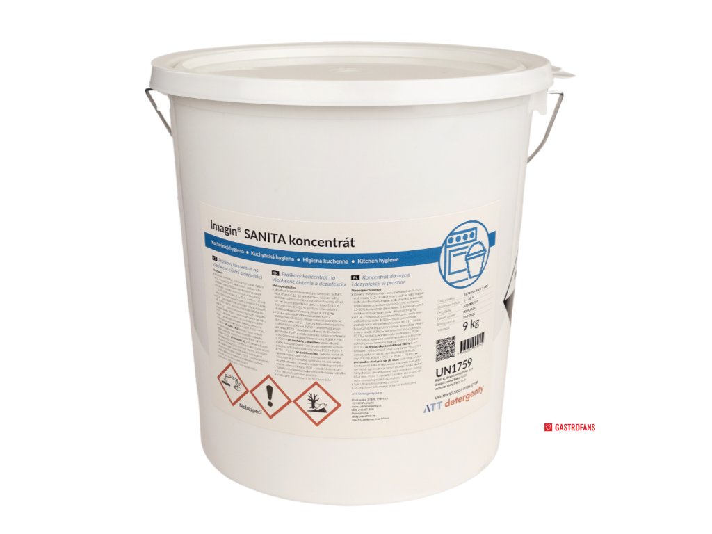 Imagin® SANITA koncentrát je profesionální práškový dezinfekční a čisticí prostředek na bázi chloru, navržený pro hloubkové čištění a sanitaci silně znečištěných povrchů. Tento práškový přípravek je ideální pro střední a velké provozy, kde je potřeba efektivně odmašťovat a dezinfikovat kuchyňská zařízení i podlahy.