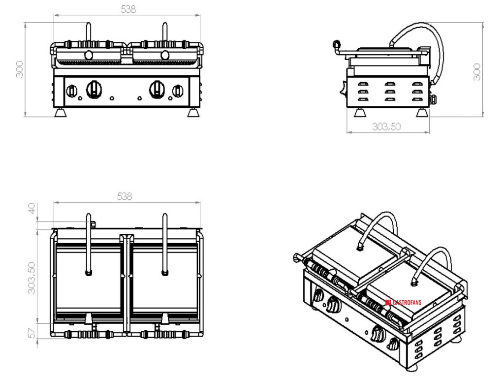Grilovací desky jsou vyrobeny z litiny, zatímco tělo grilu je z nerezové oceli. Rozměry grilu jsou 560 mm na šířku, 430 mm na hloubku a 300 mm na výšku. Grilovací plocha má rozměry 520x240 mm.