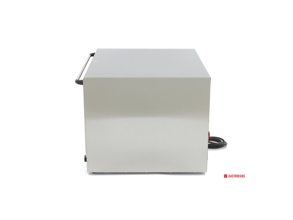 Tato profesionální konvektomat je přínosem pro každou pekárnu a kuchyni. Díky použití konvekční trouby je doba přípravy pokrmů kratší než u tradiční trouby. S touto konvekční troubou můžete pokrmy nejen ohřívat, péct a zapékat, ale také vařit v páře. Můžete tak vytvářet chutné pokrmy z trouby, koláče, dorty a masové pokrmy. Konvekční trouba je vhodná také pro pečení zeleniny a brambor. Pomocí termostatu můžete nastavit teplotu až do 300 ºC. Pokud chcete připravit křehké masové pokrmy, můžete zvolit nízkou teplotu, aby se výrobky pekly pomalu. Díky praktickému časovači budete přesně vědět, kdy je pokrm hotový. Časovač můžete nastavit v rozmezí 0 až 120 minut.
