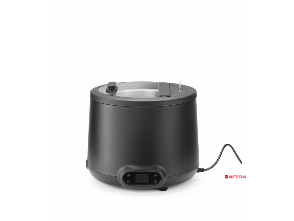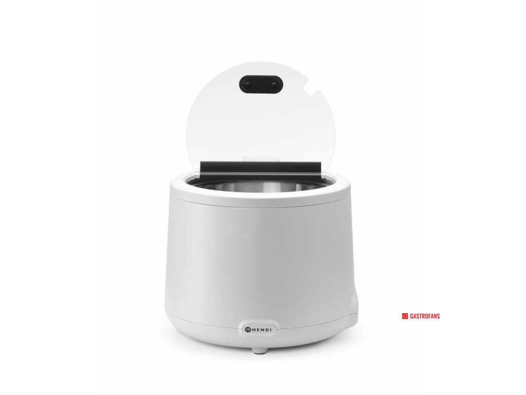 Stylový a funkční design od nizozemského designéra Roberta Bronwassera. Tělo je vyrobeno z polypropylenu odolného vůči vysokým teplotám. Vyjímatelná 8-mi litrová nádoba na polévku z nerezové oceli AISI 304, snadno se čistí. Topné těleso vyrobené z nerezové oceli AISI 304 a umístěné v nádobě na vodu pro účinný přenos tepla. Víko z tvrzeného skla s izolovanou rukojetí, výřezem na naběračku a hliníkovým závěsem. Konstrukce dvoudílného víka snižuje tepelné ztráty otevřením při zachování optimálních hygienických podmínek. Integrovaný držák karet na víku pro jmenovky výrobků. Digitální ovládací panel s displejem pro zobrazení pracovního času, nastavené teploty a aktuální teploty. Poslední nastavení teploty se uloží do paměti a zvolí se při každém zapnutí. Teplotu lze nastavit od 35˚C do 85˚C v krocích po 1˚C. Nádoba na vodu má vyraženou rysku maximálního naplnění, která udává hladinu 1,5 l. Není určena k ohřívání, pouze k udržování tepla.K dispozici ve 3 stylových barvách. Stačí ji zapojit do zásuvky, naplnit nádobu na vodu a konvice udrží pokrm při ideální teplotě pro servírování.
