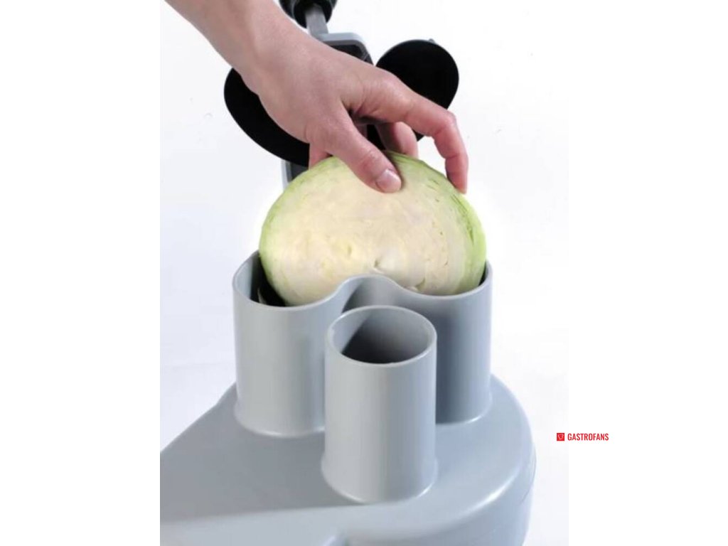 - 1× velký otvor ve tvaru ledvinky o ploše 104 cm2, objem násypky 1,6 l – určen ke krouhání větších kusů zeleniny, jako hlávkové zelí, cibule nebo rajče