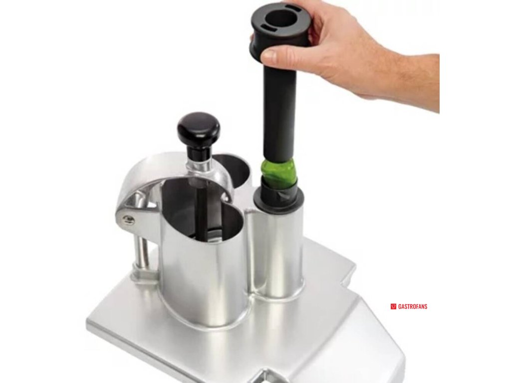 - 1 x stlačovací kolík pro drobné ovoce a zeleninu Exactitube o průměru 39 mm – na krájení drobných plodů jako jsou papričky, nakládané okurky, suché salámy, chřest, raná cibulka, banány, jahody, hrozny