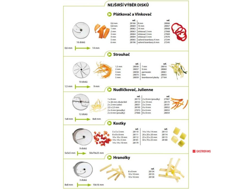 - 1985 W sada 6 disků – plátkovač 2 a 4 mm, strouhač 1,5 mm, nudličkovač 4×4 mm, kostičkovač 14×14×14 mm (2 disky – plátkovač + mřížka)