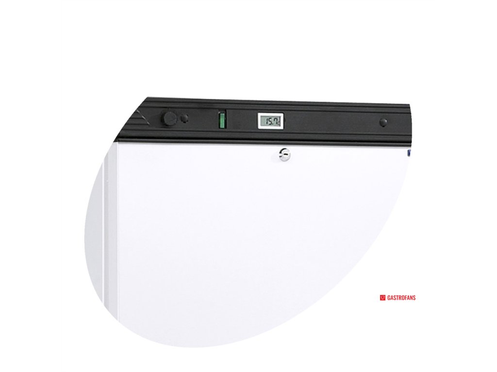 UFFS 370 SD je robustní mrazicí skříň s plnými dveřmi a statickým chlazením, ideální pro skladování mraženého zboží v gastroprovozech nebo zázemí. Nabízí čistý objem 270 l a 6 pevných polic s vysokou nosností. Dveře jsou zamykatelné a lze je otočit pro pravé nebo levé otevírání. Jednoduché mechanické ovládání doplňuje digitální teploměr, skříň je vybavena také odtokem vody pro snadné ruční odmrazování. Díky nastavitelným nožkám a kolečkům je manipulace a umístění velmi pohodlné.