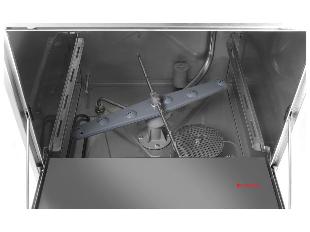 Myčka je vyrobena z nerezové oceli AISI 304 a je vybavena robustními dvoustěnnými dveřmi s mikrospínačem. Nabízí rotační i stacionární mycí a oplachová ramena, elektronické teploměry, nastavitelné nožky a integrované dávkovače mycího i oplachového prostředku.