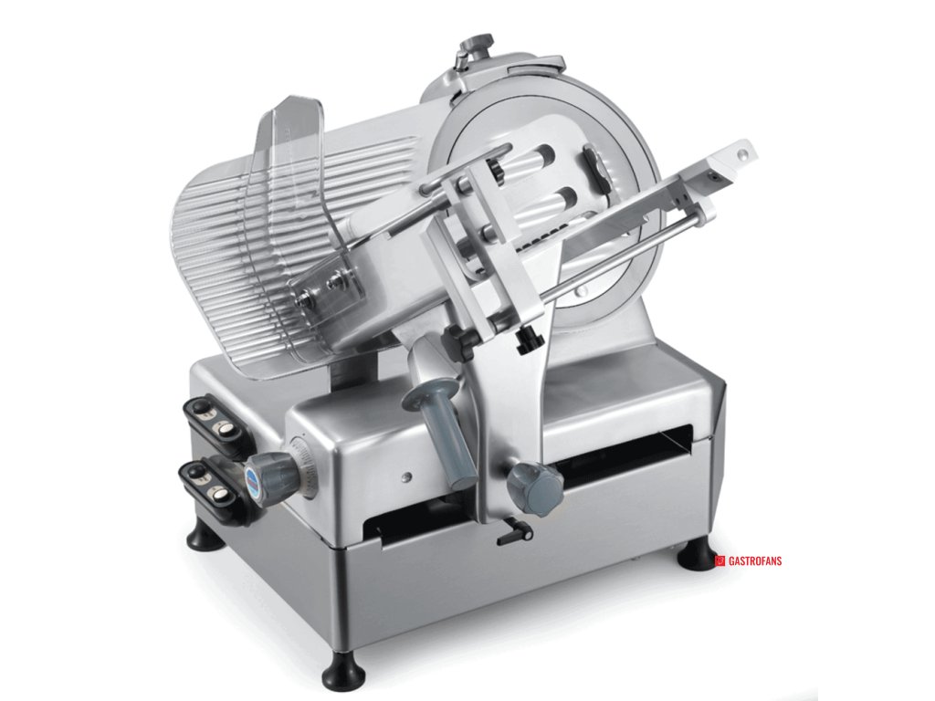 Nářezový stroj PALLADIO AUTOMEC 300 s nerezovým nožem o průměru 300 mm s uložením posuvného stolu našikmo, od itaslkého výrobce SIRMAN.