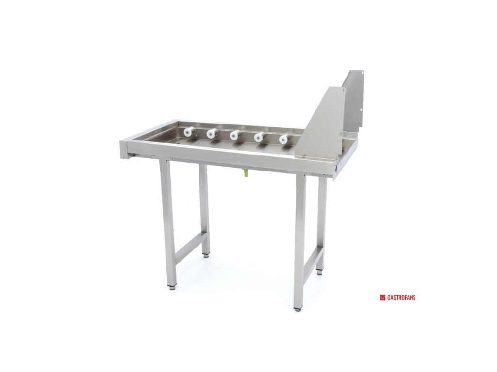 Tento válečkový stůl je vyroben z nerezové oceli, která je známá svou odolností a snadnými čisticími vlastnostmi. Připojený motor pohybuje válečky, což usnadňuje výstup čistého nádobí z myčky bez jakýchkoli komplikací.