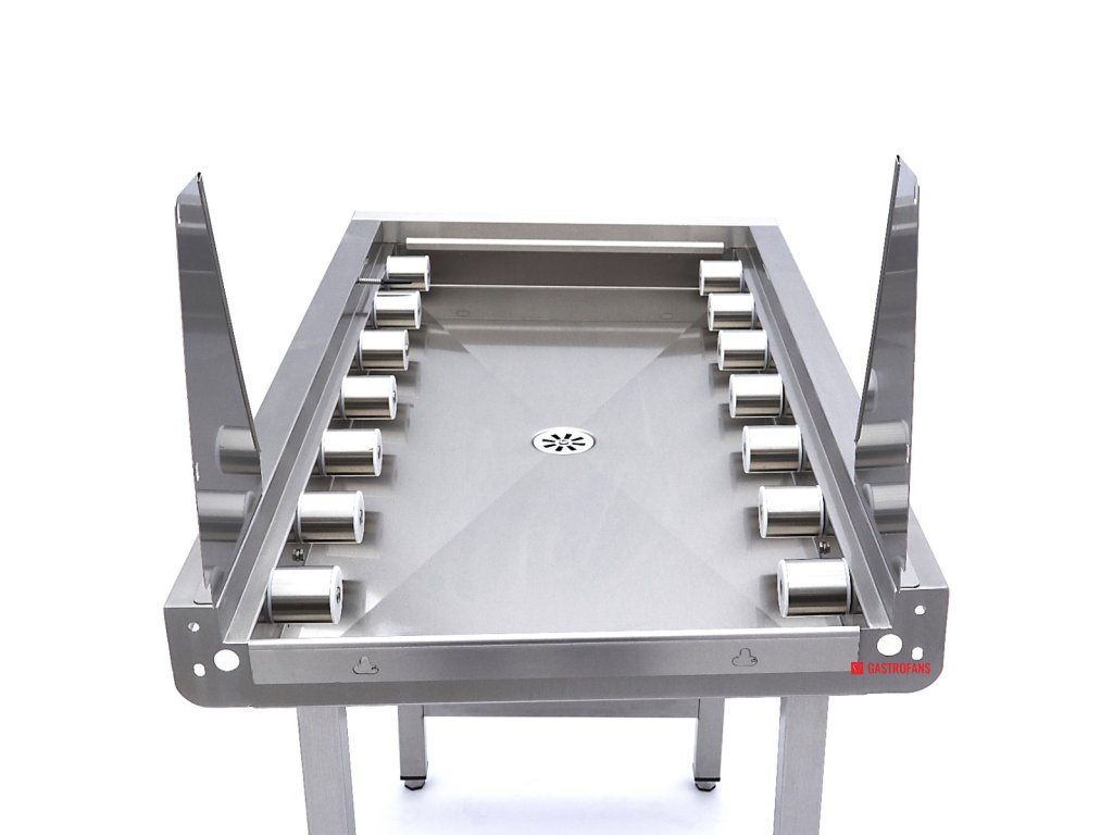 Rozměry tohoto válečkového stolu jsou š110 x h63 x v87,5 cm a je vyroben tak, aby se vešel do myčky s regálovým dopravníkem.