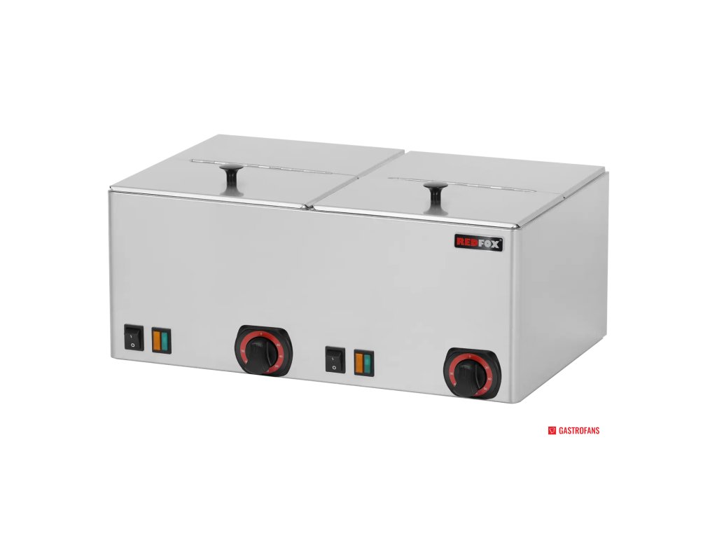 REDFOX WE 11 je stolní elektrický ohřívač uzenin s prostorem pro dvě nádoby velikosti GN 1/2 (hloubka 150 mm), určený pro profesionální použití v gastronomii. Díky robustní nerezové konstrukci, výkonnému ohřevu (2 kW) a variabilnímu nastavení teploty od 30 °C do 90 °C je ideální pro udržení teploty klobás, uzenin, snacků či hot-deli produktů připravených k okamžitému servisu.