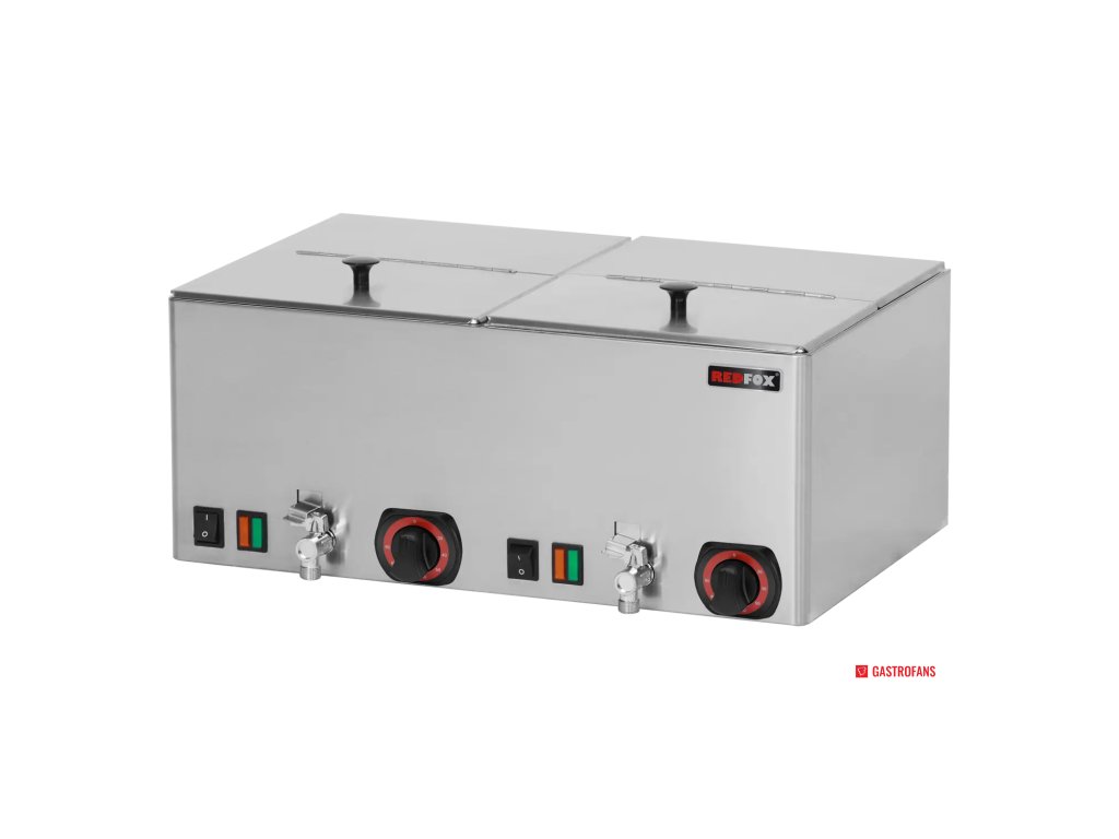 REDFOX WEV 11 je výkonný stolní elektrický ohřívač určený pro profesionální gastronomické provozy, který disponuje dvěma nádobami GN 1/2 (hloubka 150 mm) a praktickou výpustí pro odvod přebytečné tekutiny. S nerezovou konstrukcí, výkonem 2 kW a nastavitelným teplotním rozsahem od 30 °C do 90 °C je ideální volbou pro udržení teploty uzenin, hot-deli produktů či snacků připravených k okamžitému servisu.