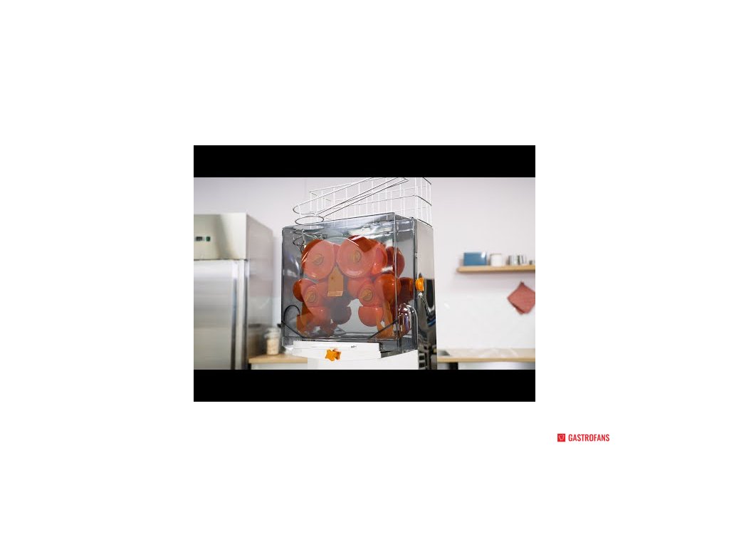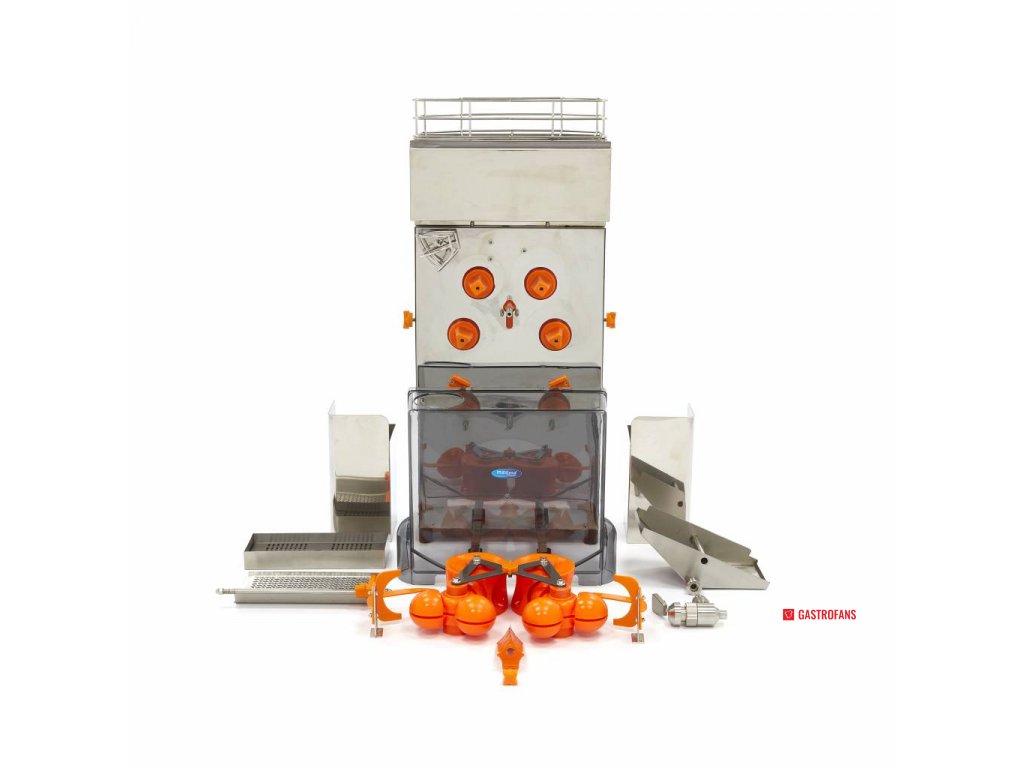 Díky samoobslužnému kohoutkovému systému si hosté a zákazníci mohou snadno naplnit vlastní láhve nebo sklenice vysoké až 17 cm. Tento automatický odšťavňovač je také vybaven systémem X-cross, který usnadňuje vyjmutí lisovacího mechanismu jedním tahem za účelem čištění. Odšťavňovač je také vybaven dvojitým filtrem na šťávu pro zachycení semínek a praktickým posuvným ramenem pro odstranění dužiny a odpadu. Digitální počítadlo pomerančů počítá vylisované pomeranče. Kromě toho má tento odšťavňovač silný motor a lisovací systém s kovovými převody a několika bezpečnostními spínači pro bezpečný provoz.