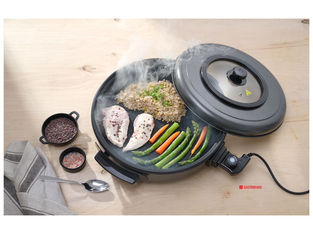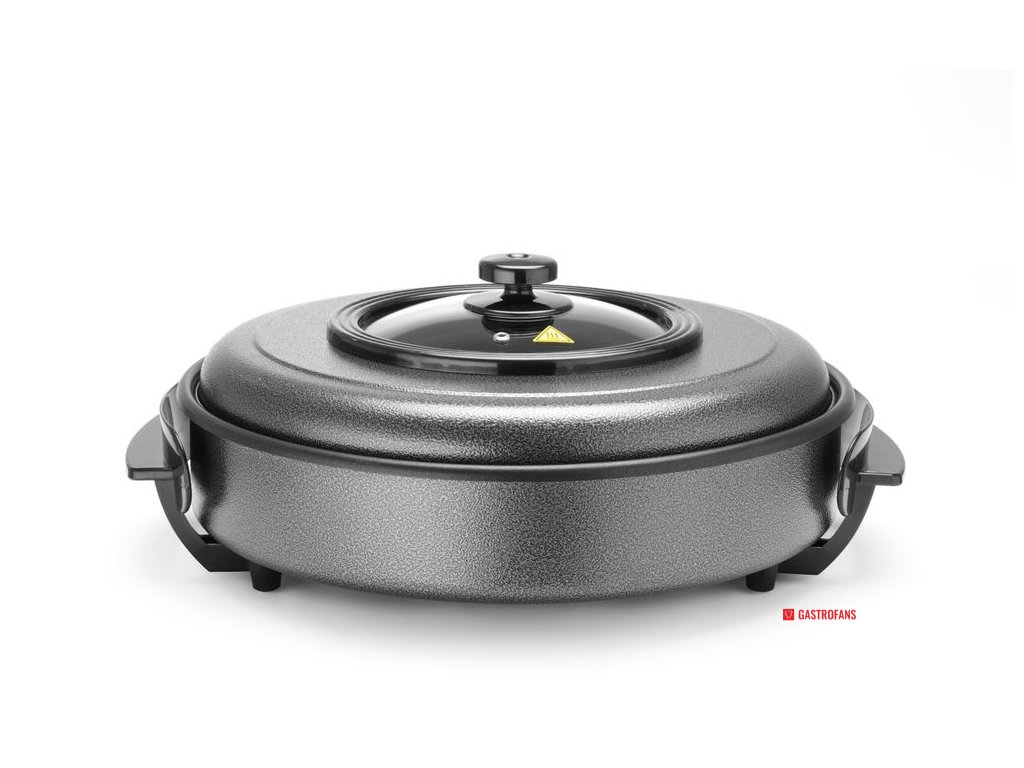 Hliníková s nepřilnavým povrchem. Odnímatelný termostat. Vhodná pro smažení, pečení a udržování pokrmů v požadované teplotě. Včetně víka se skleněným průzorem a 2 izolovaných rukojetí.