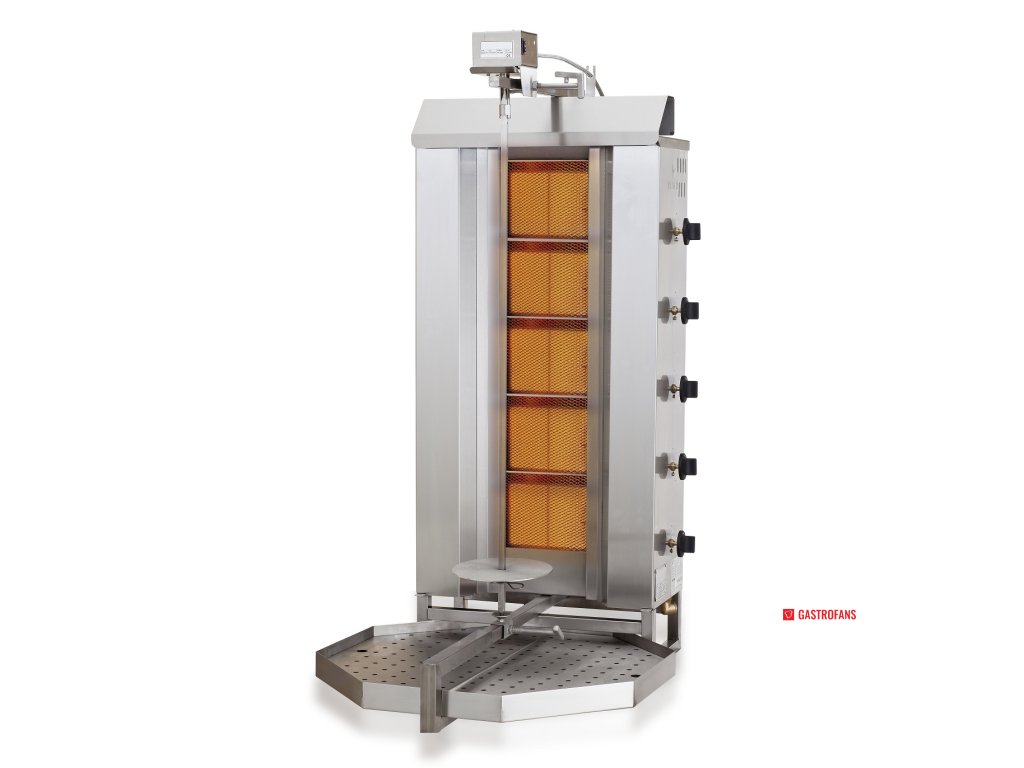 Gyros gril s 5 zónami ohřevu je ideální volbou pro profesionální kuchyně, které potřebují efektivní a rovnoměrné grilování masa. Tento model je vybaven výkonným motorem umístěným nahoře, což zajišťuje stabilní a spolehlivý provoz.