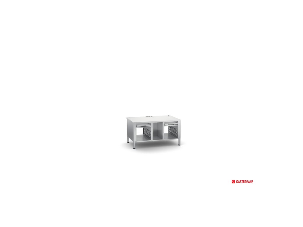 Díky integrované zásuvce můžete pod zařízení umístit nádoby pro bezpečné a pohodlné vyprázdnění pánve. Podstavec je vybaven třemi nosnými lištami pro uložení GN nádob a příslušenství. Výřezy pro instalační přípojky a odtoky umožňují montáž základního rámu přímo ke stěně. Boční stěny a horní část jsou uzavřené, zadní strana je otevřená pro snadný přístup k instalacím.