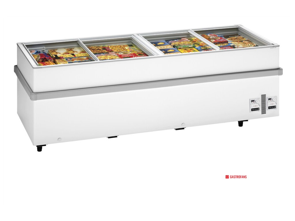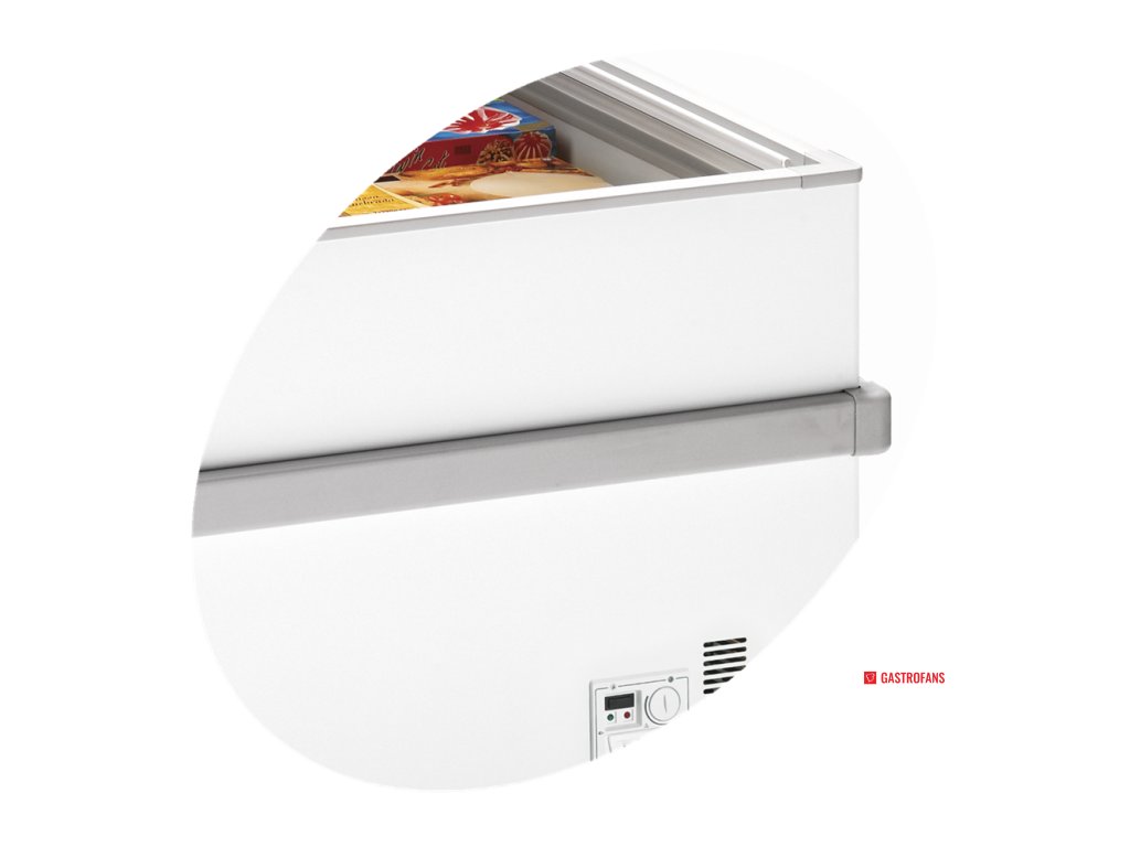 Pultová mraznička SS F250 nabízí velkorysý úložný prostor, vysokou provozní spolehlivost a maximální přehled o vystaveném zboží díky čtyřem posuvným proskleným víkům. Je určena především pro instalaci ostrovů v supermarketech, potravinách a prodejních zónách s důrazem na viditelnost a rychlý přístup k produktům.