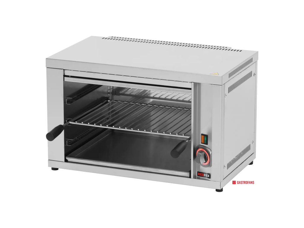 REDFOX SE 40 S je výkonný stolní salamandr určený pro profesionální gastronomické provozy — ideální pro opékání grilování či gratinování pokrmů. Zařízení disponuje nerezovým tělem, mechanickým ovládáním a třemi polohami roštu, které umožňují přesnou regulaci nad ohřevným tělesem s příkonem 2,2 kW. Odnímatelná zadní stěna a zásuvka pro údržbu dělají z tohoto přístroje spolehlivou volbu pro kavárny, bistry, hotelové provozy i rychlé stravování.