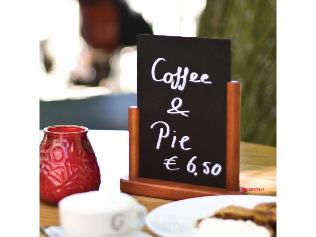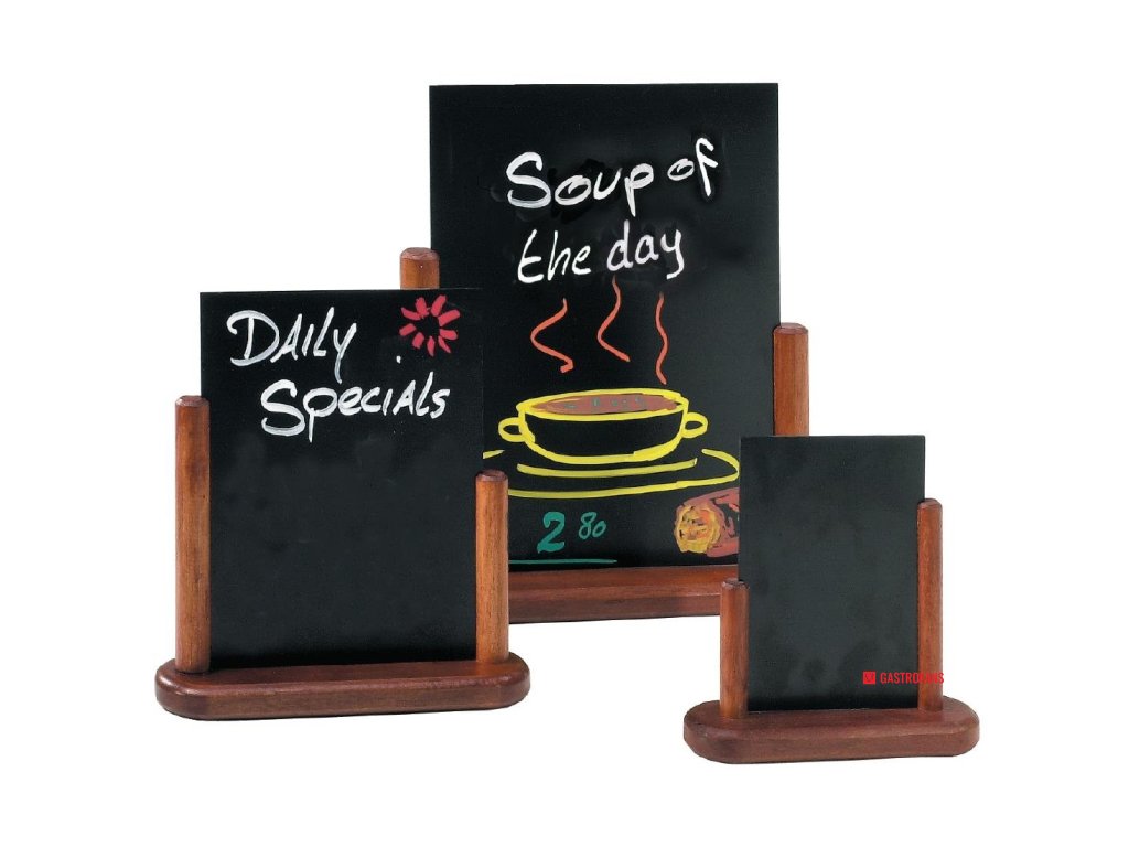 Prosté, ale efektivní tabule na stůl nebo bar jsou ideální k vystavení denních specialit. Pevný bukový stojan s mahagonovou povrchovou úpravou. Tabule se dají jednoduše vyjmout ze stojanu a následně popsat na obou stranách.Doplňkové parametry