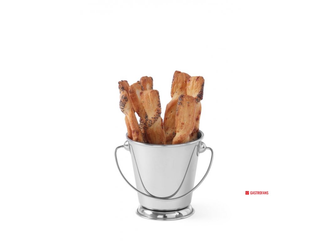 Miniaturní kbelík na občerstvení s rukojetí je elegantním doplňkem pro profesionální catering i domácí použití. Ideální pro podávání všech druhů občerstvení. Je vyroben z nerezové oceli. Má pohodlnou rukojeť. Lze mýt v myčce nádobí.Doplňkové parametry