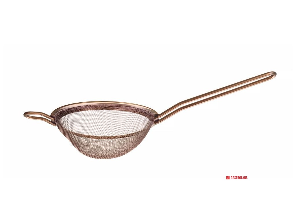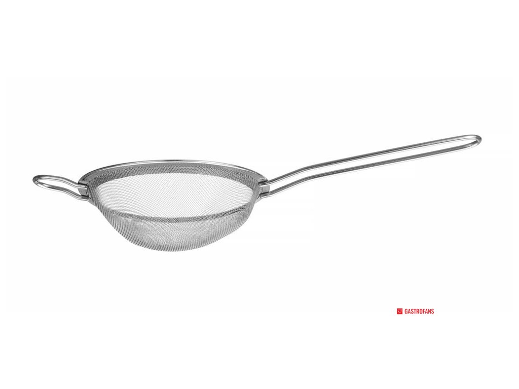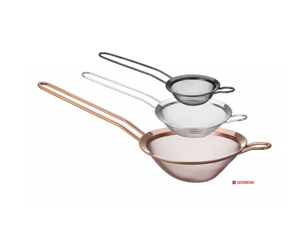 Vyrobeno z práškově lakované nerezové oceli AISI204. S malou podpěrou pro umístění síta na hrnec nebo mísu nebo pro jeho zavěšení. Rozměry: - síto černé barvy: ⌀74 mm, (D)215 mm, (V)25 mm, - síto stříbrné barvy: ⌀105 mm, (D)245 mm, (V)30 mm, - měděné síto: ⌀144 mm, (D)337 mm, (V)45 mm. Délka rukojeti: - černě zbarvené síto: 115 mm, - sítko stříbrné barvy: 120 mm, - sítko měděné barvy: 165 mm. Velikost ok: - černě zbarvené síto: 1×1 mm, - sítko stříbrné barvy: 1×1 mm, - sítko měděné barvy: 1,5 × 1,5 mm. Nelze mýt v myčce nádobí.