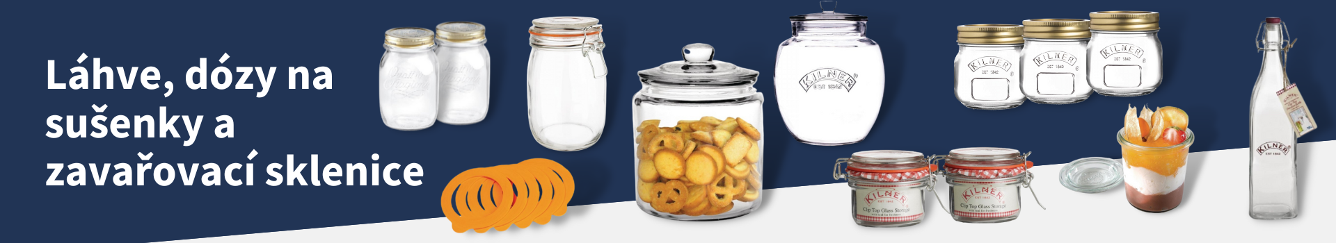 V naší nabídce najdete velmi praktické skladovací dózy pro uchování nejrůznějších potravin jako džemy, nakládanou zeleninu nebo suché potraviny typu rýže, cukru nebo mouky. Dózy na sušenky, zavařovací sklenice nebo i láhve s klipem jsou velmi dobrý pomocník. K dispozici máme sklenice se skleněnými víčky, zavařovací sklenice se šroubovacími víky nebo sklenice s elegantním pákovým víkem s neprodyšným gumovým těsněním. Upečte si cukroví a uchovejte je v krásných dózách značky Kilner.