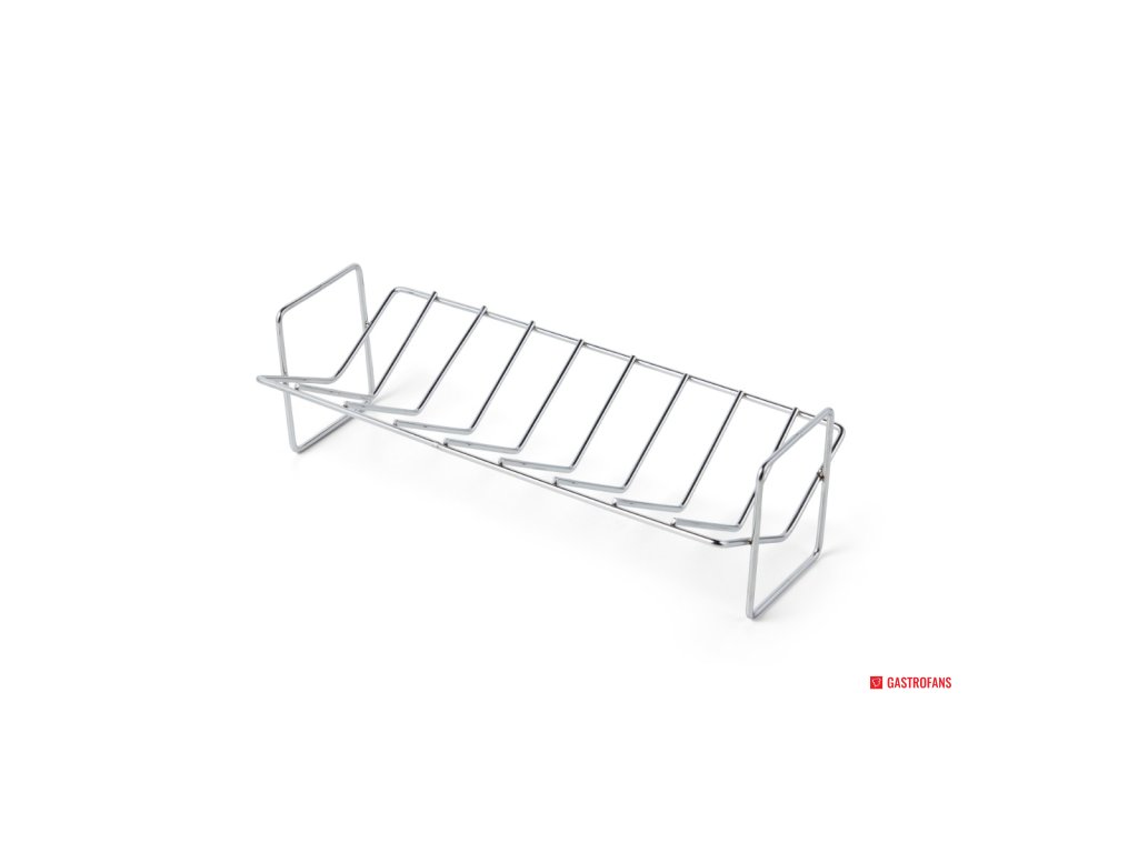 Stojan s hřbety položte na horní část grilu. Tímto způsobem se žebra, kuřecí stehna nebo kotlety rovnoměrně propečou. Stojan na žebra z nerezové oceli se snadno čistí. Doporučujeme potřít potraviny olejem na vaření, aby se zabránilo jejich přichycení ke stojanu na sparerib.