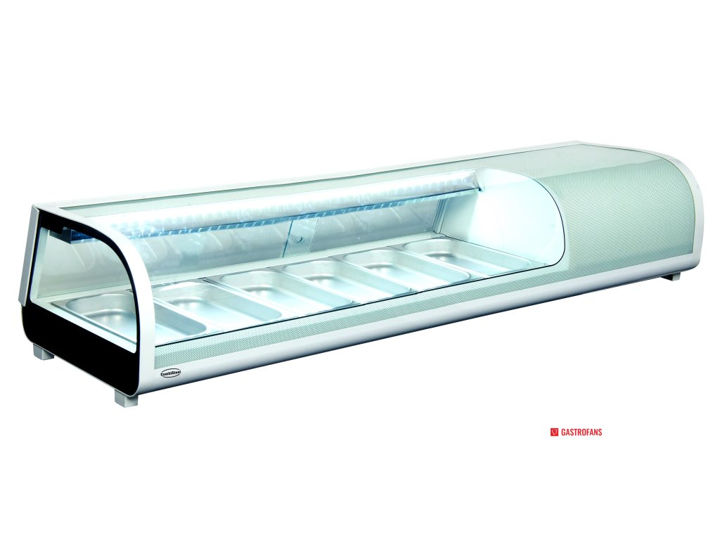 Vitrína je vyrobena z kvalitních materiálů, které zajišťují dlouhou životnost. Rozměry jsou: šířka 1529 mm, hloubka 426 mm, výška 296 mm. Obsahuje 6x 1/3 GN nádoby s maximální hloubkou 40 mm.
