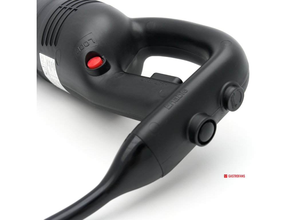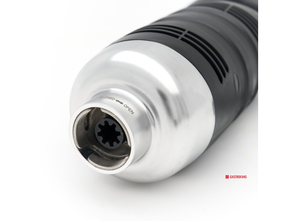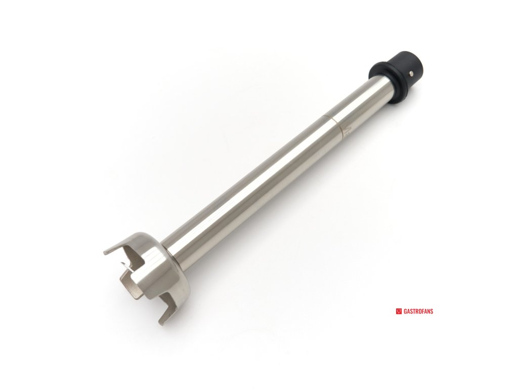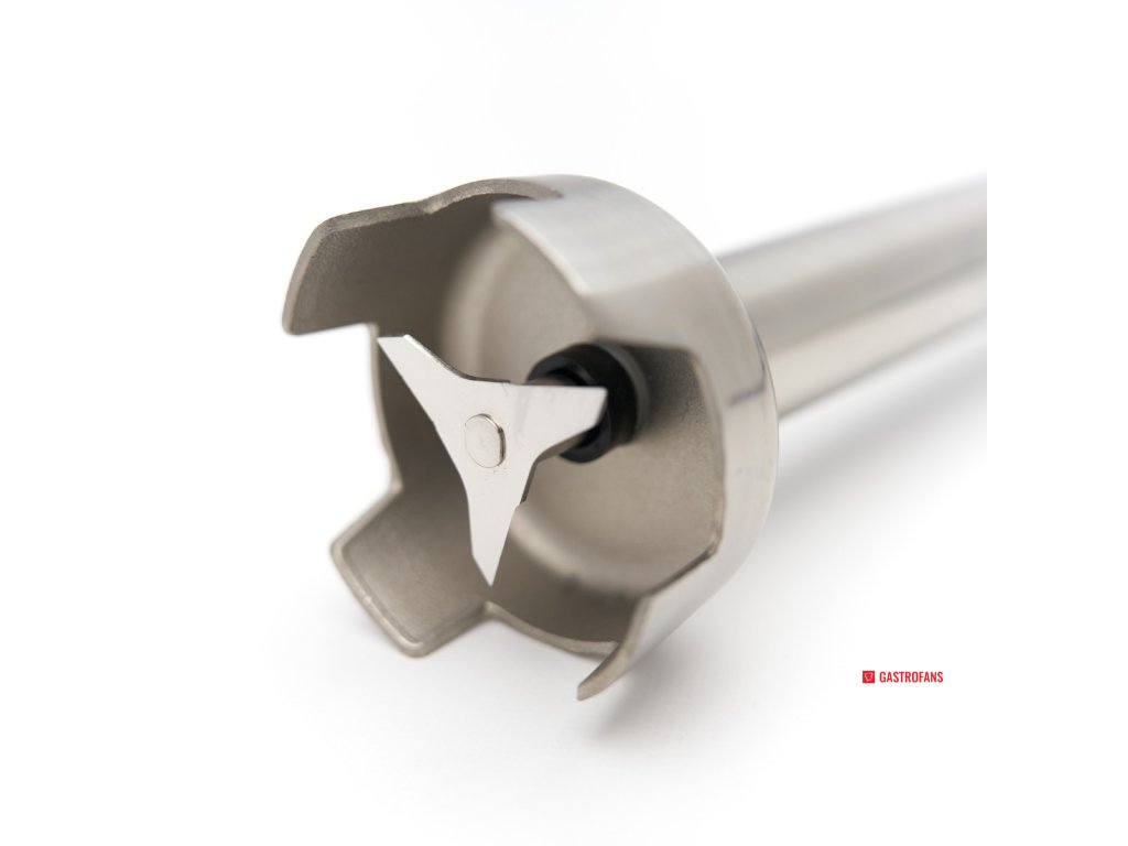 Odnímatelná hřídel o délce 36 cm je vyrobena z odolné nerezové oceli a připojuje se k zesílenému krytu nože s dvojitým ložiskem. Hloubka zasunutí 27 cm je ideální pro větší nádoby a pomáhá zefektivnit přípravné práce ve velkokapacitních kuchyních bez ztráty kontroly. Díky úzkému průměru hřídele a dobře vyvážené konstrukci je překvapivě hbitý a nabízí plnou manévrovatelnost i při náročném používání.