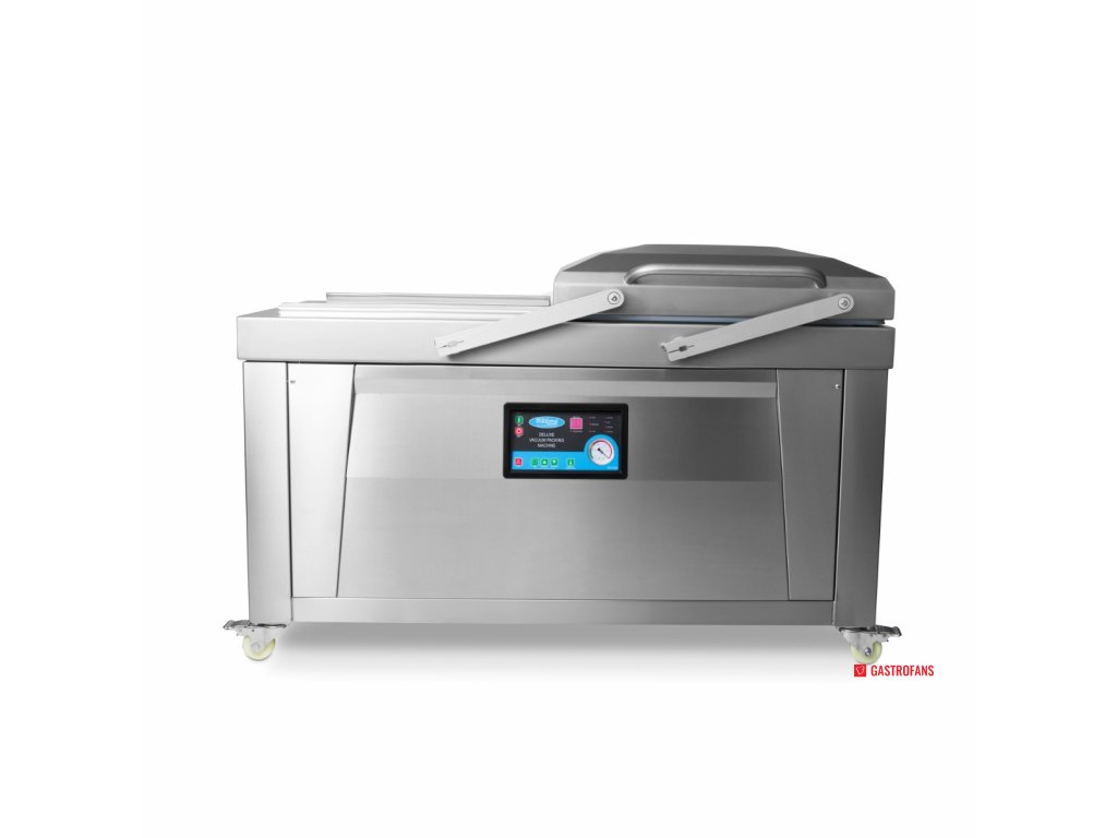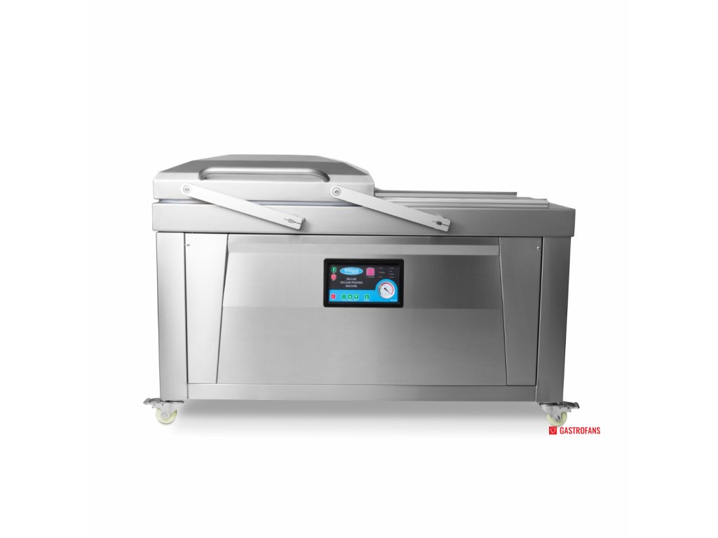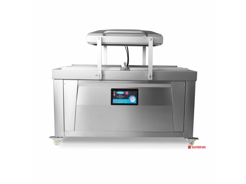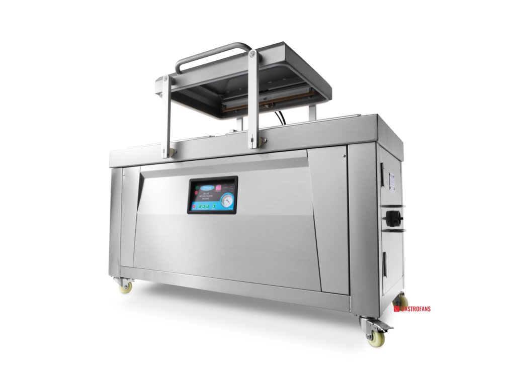 Parametr Hodnota Typ Dvojkomorový vakuový balicí stroj Těsnicí lišta 2× (60 × 0,8 cm) na každou komoru Rozměry komory (ŠxHxV) 76 × 60 × 16 cm Rozměry stroje (ŠxHxV) 151 × 68,5 × 96 cm Výkon čerpadla 2 × 20 m³/h Příkon 2 × 750 W Napětí 230 V / 50 Hz / 1 fáze Čistá hmotnost 285 kg Ovládání Digitální panel, plně programovatelný Materiál Nerezová ocel Mobilita 4 kolečka s brzdami Bezpečnostní prvky Spínač ve víku