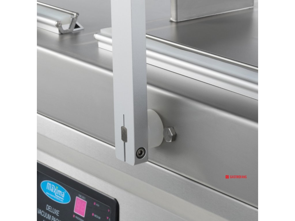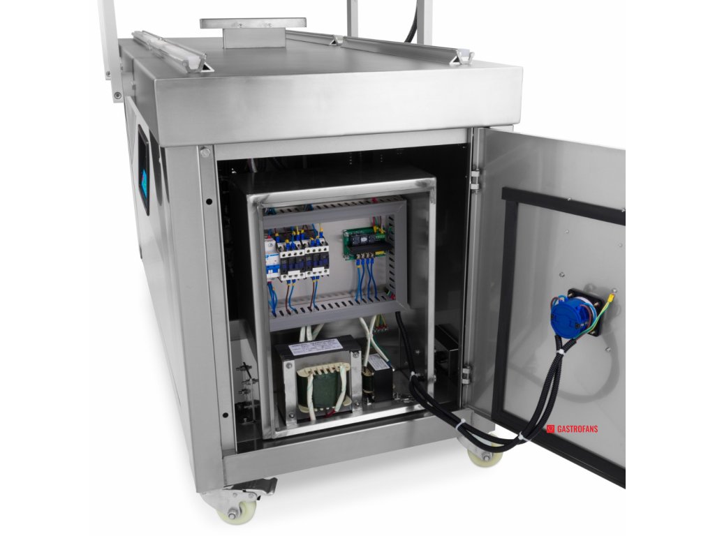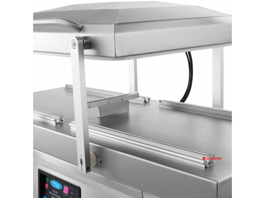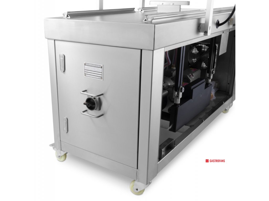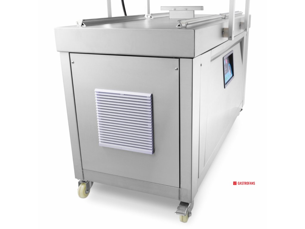 Parametr Hodnota Typ Dvojkomorový vakuový balicí stroj Těsnicí lišta 2× (60 × 0,8 cm) na každou komoru Rozměry komory (ŠxHxV) 76 × 60 × 16 cm Rozměry stroje (ŠxHxV) 151 × 68,5 × 96 cm Výkon čerpadla 2 × 20 m³/h Příkon 2 × 750 W Napětí 230 V / 50 Hz / 1 fáze Čistá hmotnost 285 kg Ovládání Digitální panel, plně programovatelný Materiál Nerezová ocel Mobilita 4 kolečka s brzdami Bezpečnostní prvky Spínač ve víku
