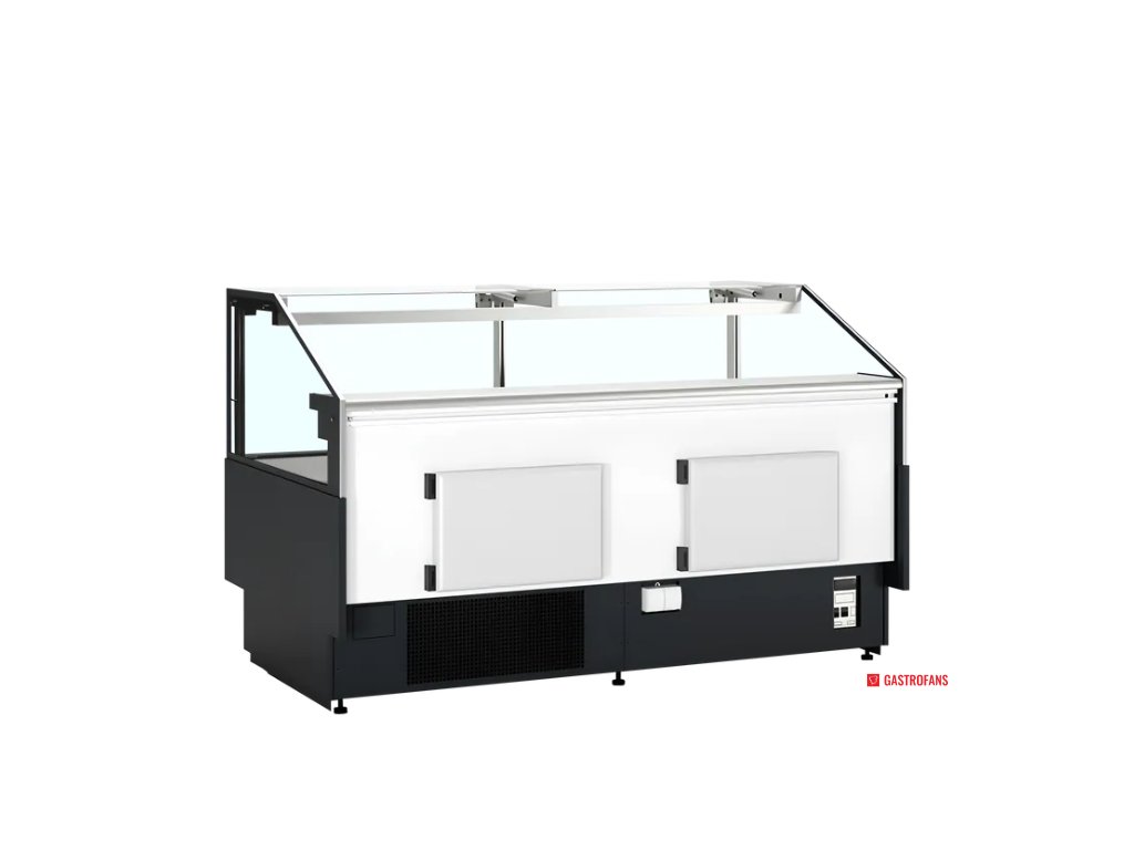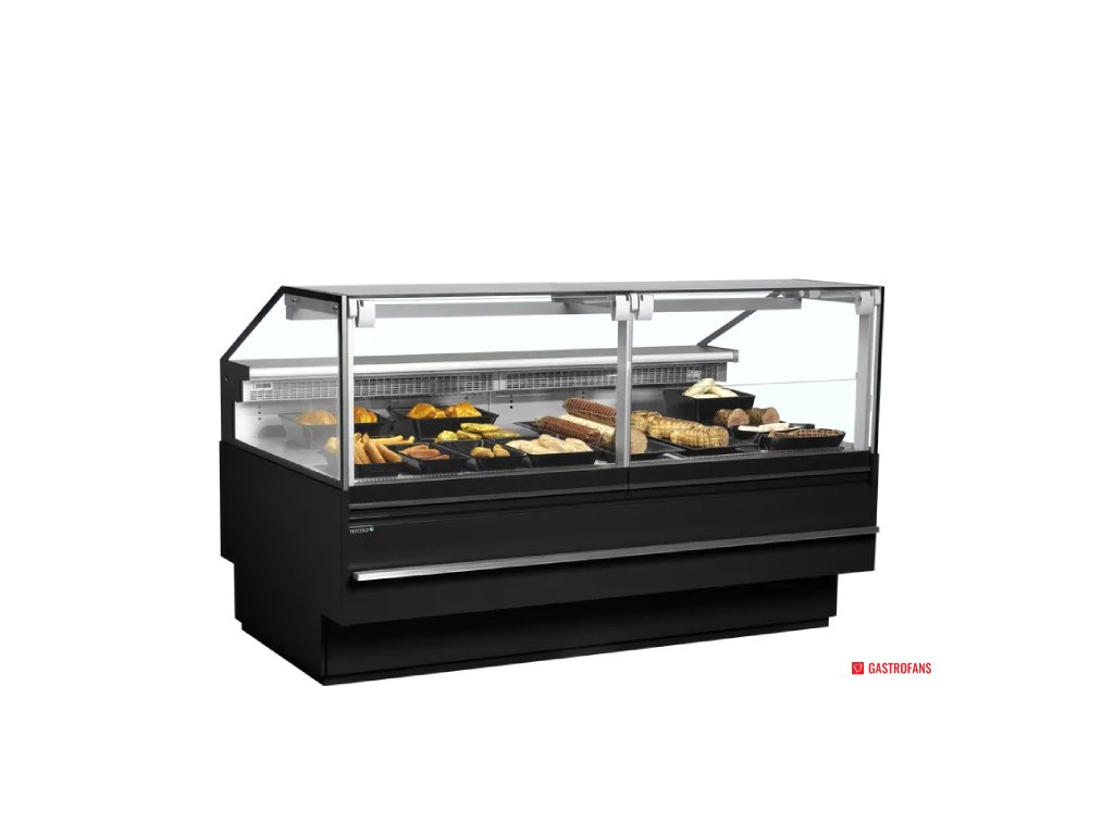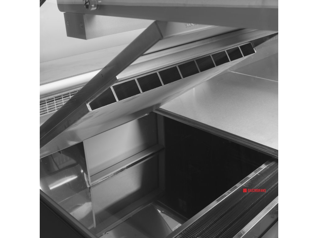 Přední sklo s ochranou proti mlžení zajišťuje nepřerušený výhled na vystavené produkty. Sklo je zvedací a zůstává bezpečně v otevřené poloze, což výrazně usnadňuje každodenní čištění i obsluhu. Horní LED osvětlení zvýrazňuje čerstvost a barvy vystaveného zboží.