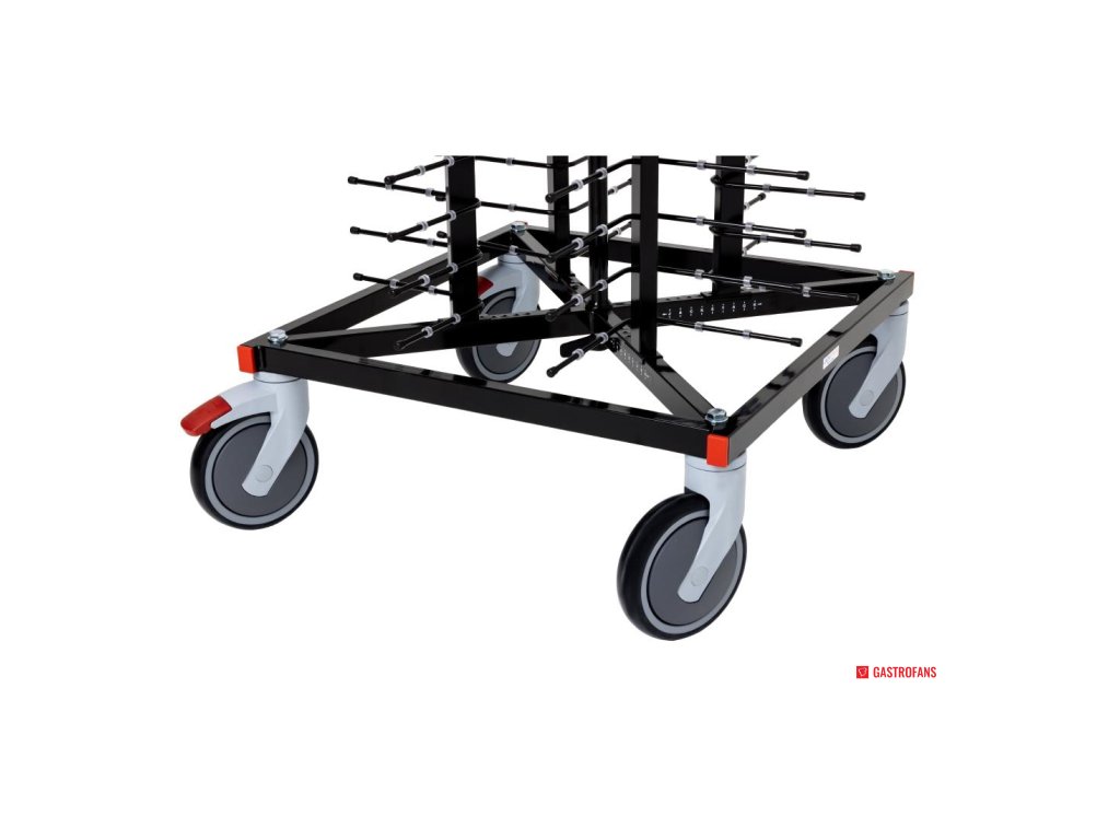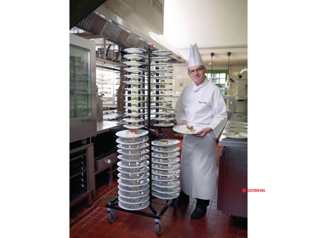 Vozík na talíře vyrobený systémem Jackstack s kapacitou 104 talířů Jackstack