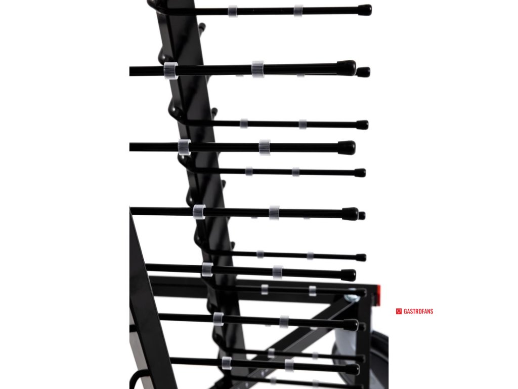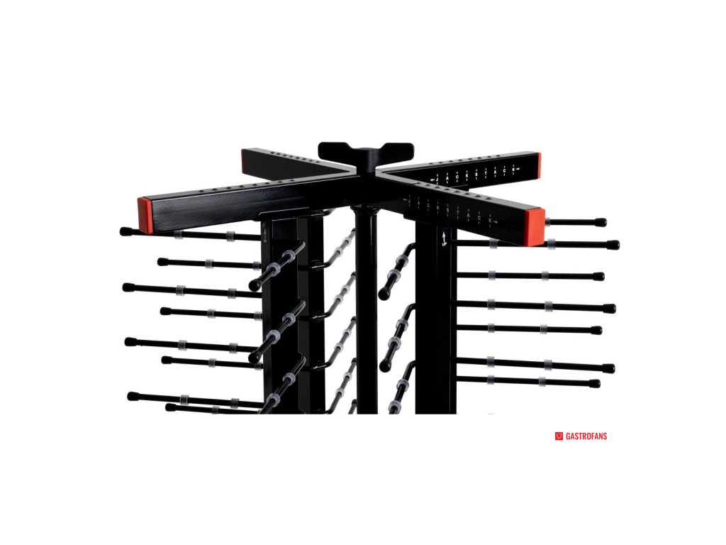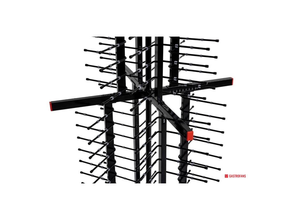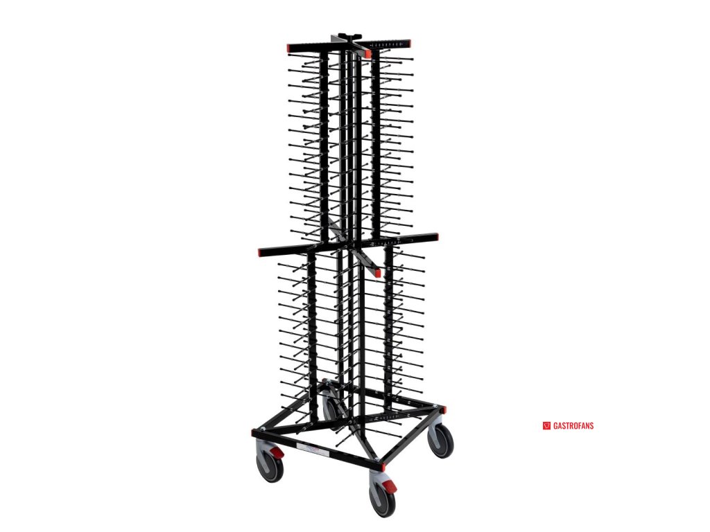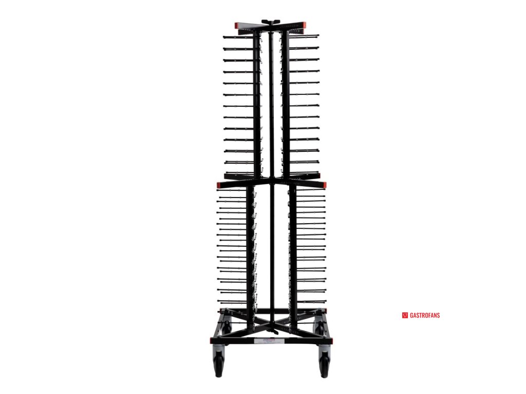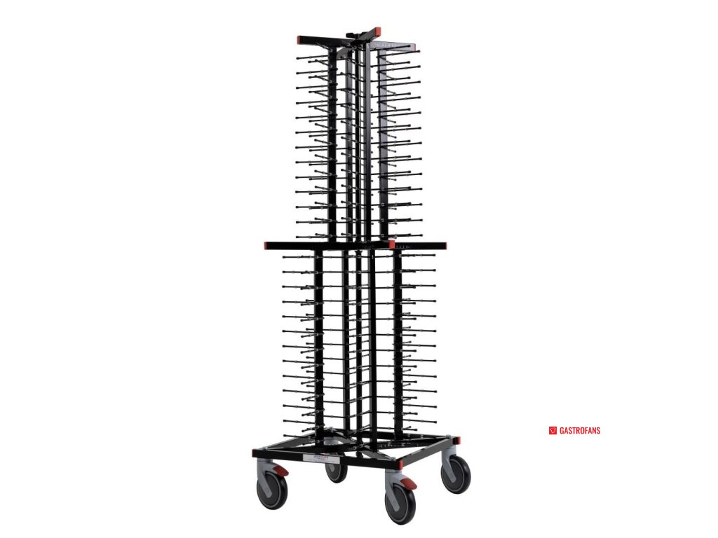 Místo na 104 talířů (127–305mm) s mezerou 50mm mezi podpěrami. Plně mobilní na kolech 150mm (dvě z nich s brzdou). 1790 x 600 x 600mm. Držáky talířů 170mm.Doplňkové parametry