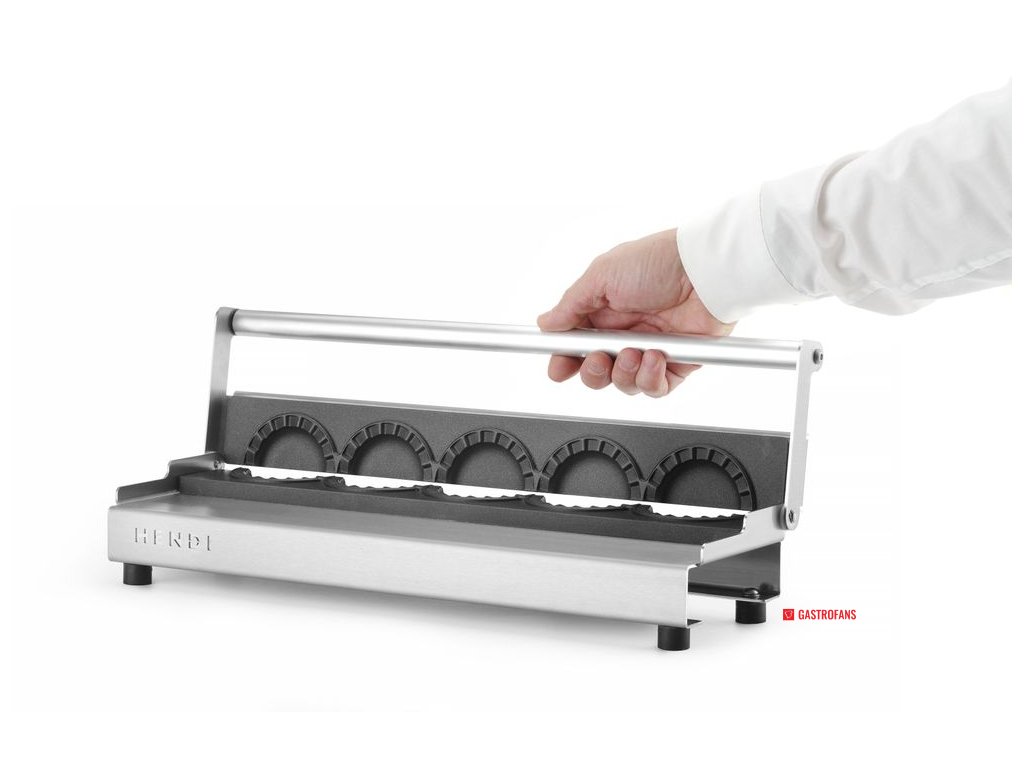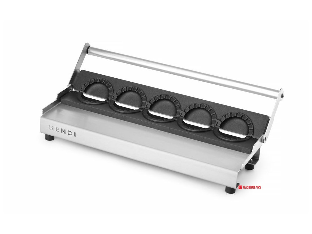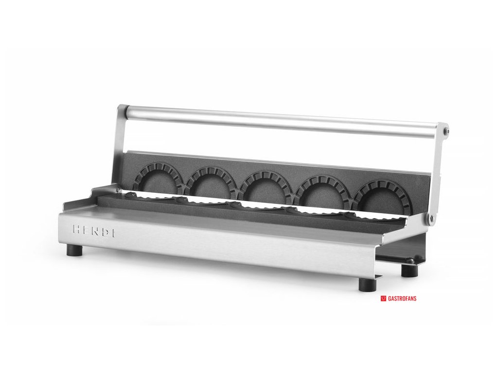 Knedlíkovač HENDI je řešením pro snadnou a rychlou tvorbu knedlíků, protože umožňuje připravit 5 knedlíků najednou. Formy jsou opatřeny nepřilnavým povrchem, který zajišťuje snadné vyjmutí knedlíků. Rukojeť po celé délce formy umožňuje rovnoměrný tlak na všechny formy. Čtyři protiskluzové nožičky z pryže zaručují, že knedlíkovač bude během používání stabilní.